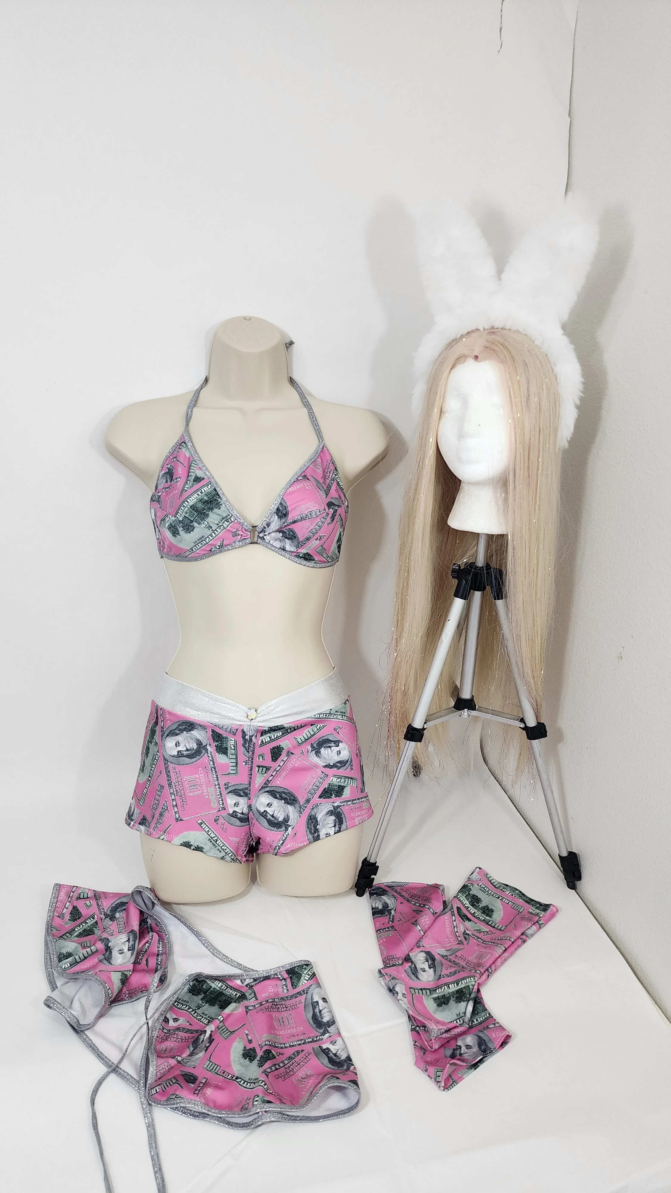 Image 1 of 1 easter pink money dance set $65.00 Size XS-S 4-way stretch bikini top, mini shorts, tie on skirt, fingerless gloves, and fuzzy bunny ears. Add To Cart Added! Size XS-S 4-way stretch bikini top, mini shorts, tie on skirt, fingerless gloves, and fuzzy bunny ears.
