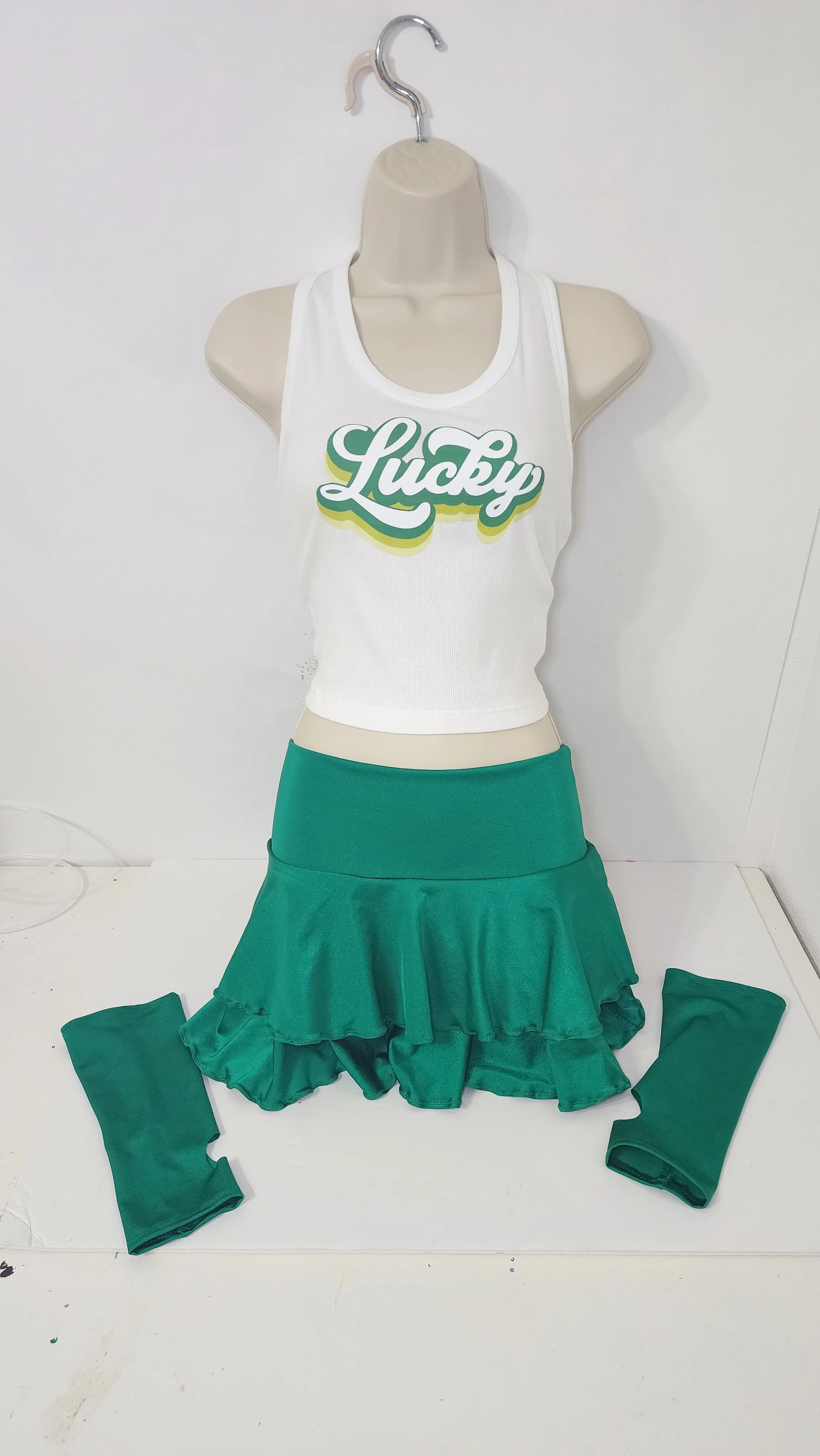 Image 1 of 1 lucky mini skirt set $45.00 Size XL-XXL. Double tiered lettuce hem mini skirt, cropped tank top with graphic, with matching green fingerless gloves. Add To Cart Added! Size XL-XXL. Double tiered lettuce hem mini skirt, cropped tank top with graphic, with matching green fingerless gloves.
